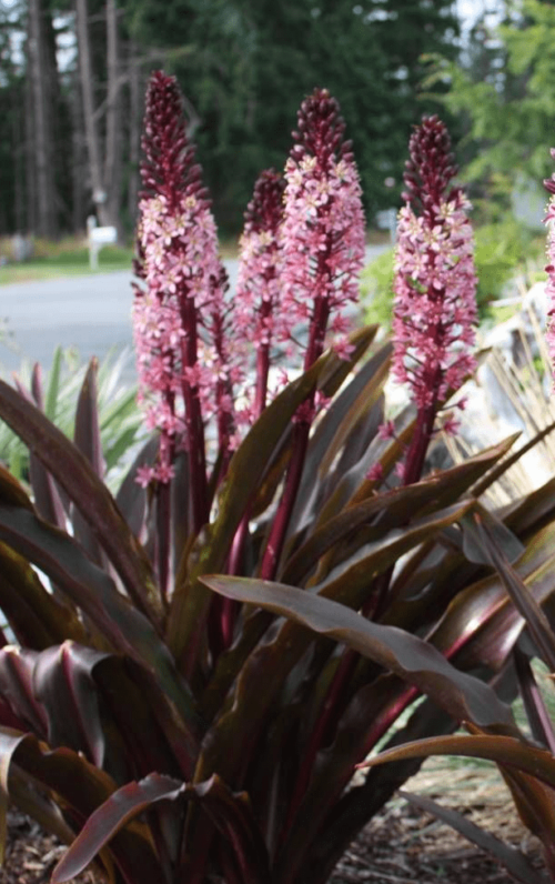 ‘Pineapple Flower’. Attractive summer flowering bulb which should be brought indoors for the winter. They give a showy display in late summer and can be grown very successfully as pot plants.
