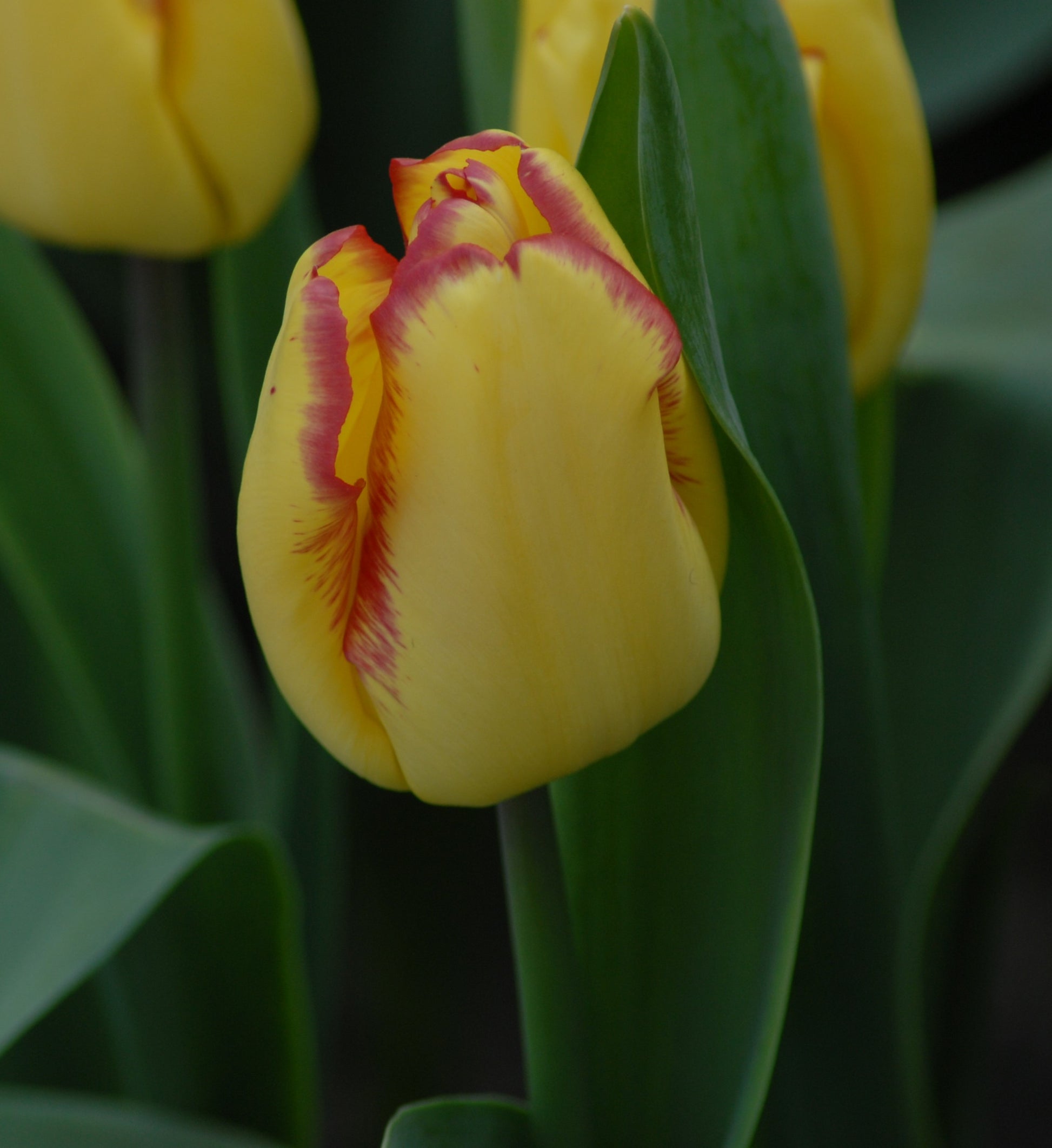 A very attractive short tulip with deep golden yellow flowers edged deep red.