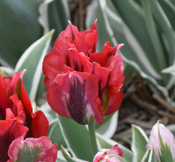 Deep china-rose flamed green and silver fading to reddish-brown. Greenish-yellow base. Attractive silvery white stripe along foliage.