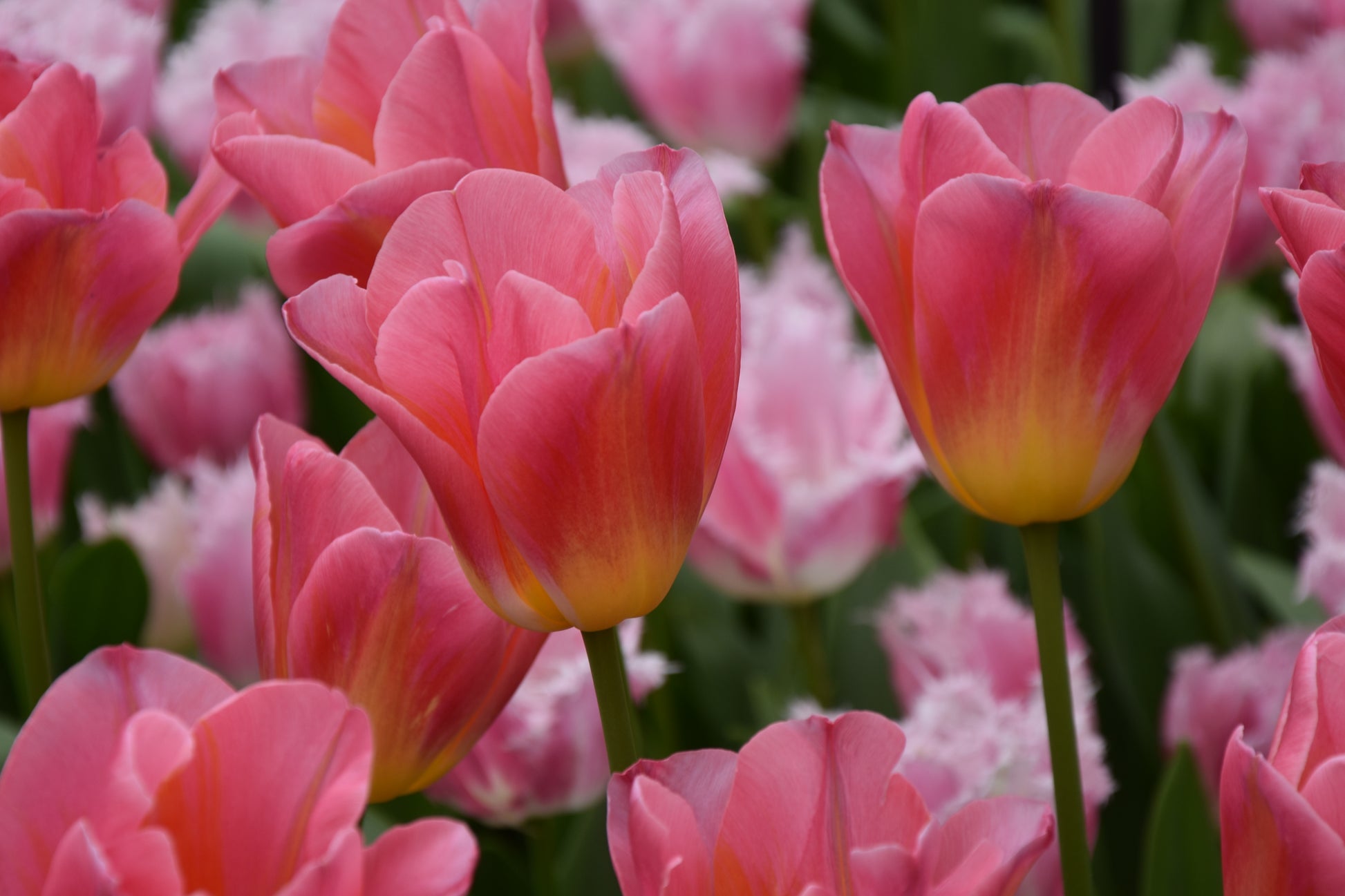 Creamy yellow base rising to hot pink -purple petals. white, broadly edged with carmine-pink. Ht 50cm