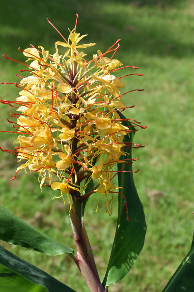 Scented. A truly magnificent plant. Flower spikes up to 14" long. Lemon-yellow with a red filament. Native to the Himalayas in India, Nepal and Bhutan these uncommon but useful plants can be treated like Cannas for summer bedding and in some areas are hardy. Plant in a rich soil, water and feed with a liquid manure copiously. If planted in pots or tubs, water several times daily. The foliage is attractive and many of the species are sweetly scented. If planted outdoors grow in a humus rich well-drained soil in a sunny sheltered position.