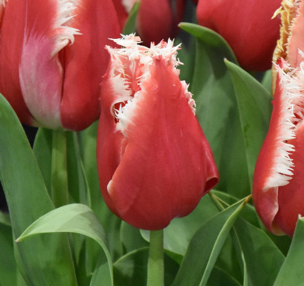A bright red tulip with a pure white fringe.