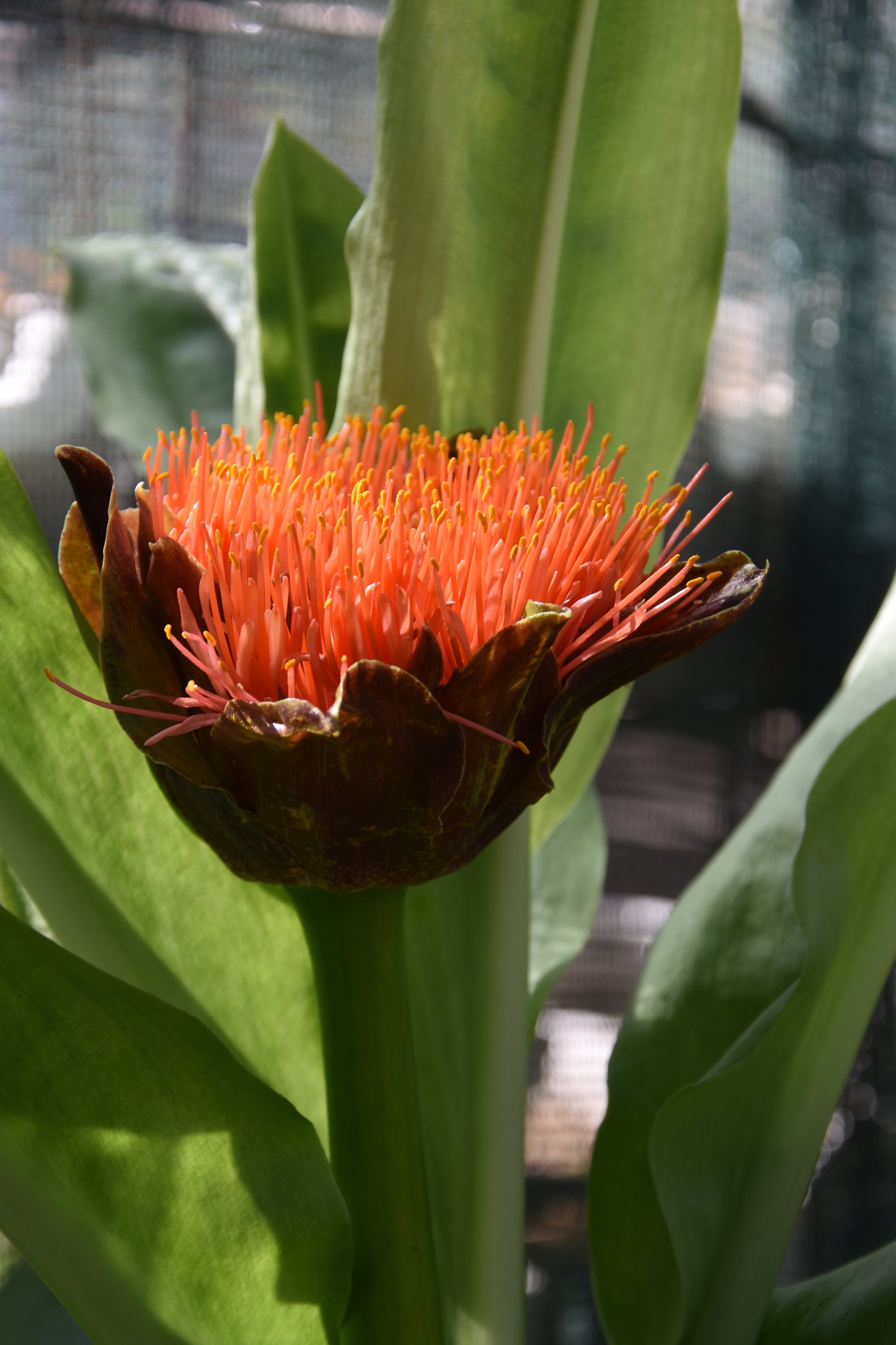 Scadoxus puniceus, also called the blood lily or paintbrush lily, is a distinctive species native to southern Africa. It produces a large, spherical flower cluster up to 20 cm across, featuring tubular blooms in vivid red or orange hues. Blooming typically takes place from late spring to early summer. This plant thrives best in a cool greenhouse or conservatory environment. Water should be applied sparingly until new growth emerges to ensure optimal development.